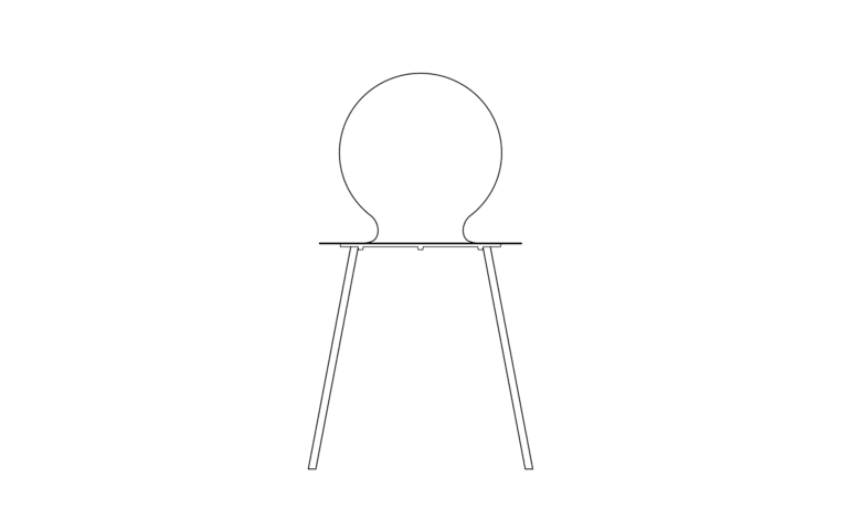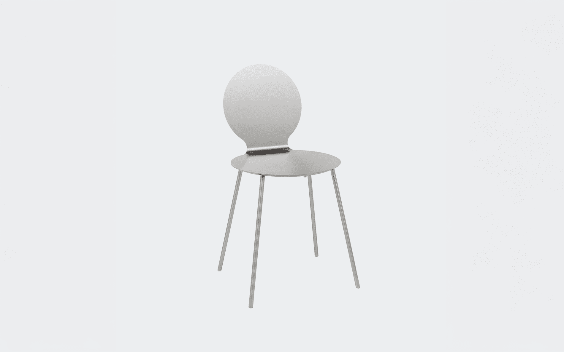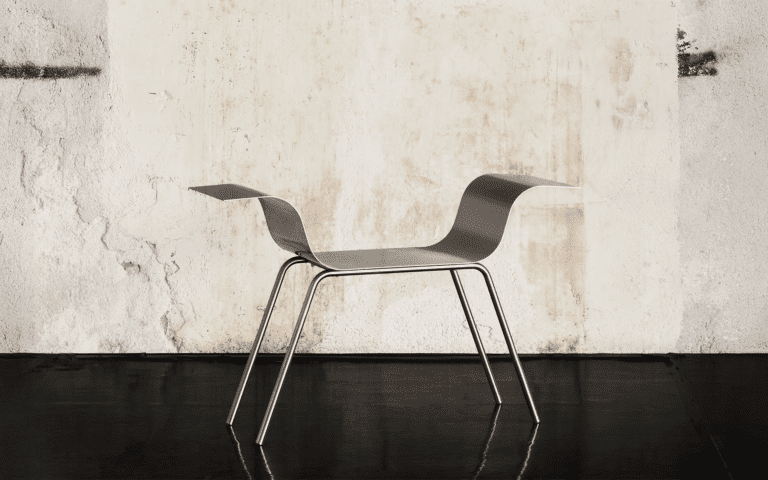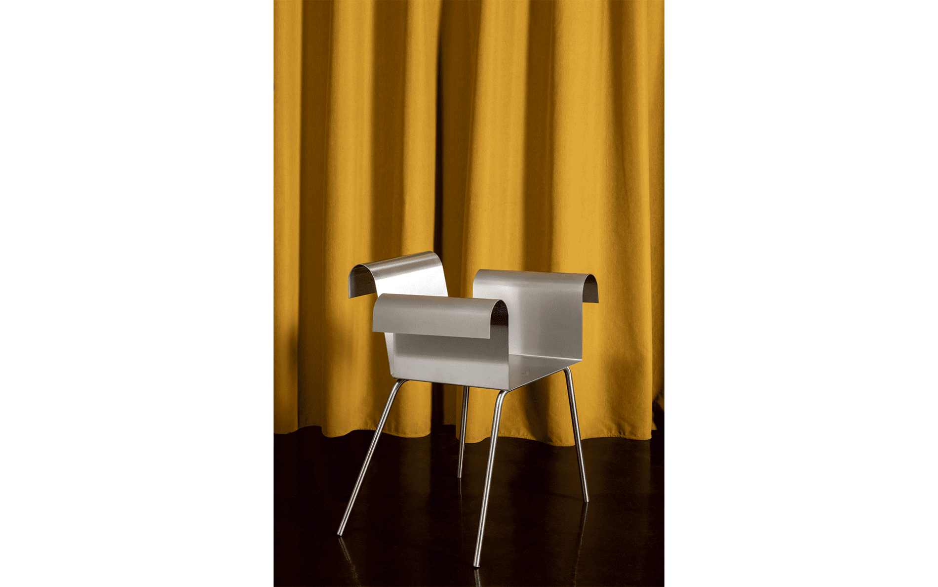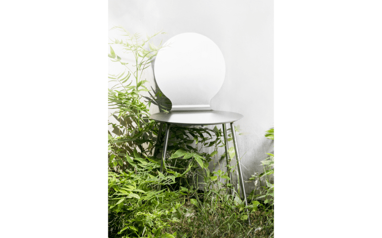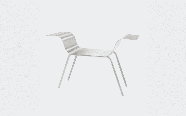 The steel sheet is bent to create two symmetrical curves. The chair balances between lightness and support, its form appearing lighter than it truly is.