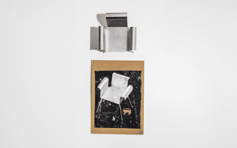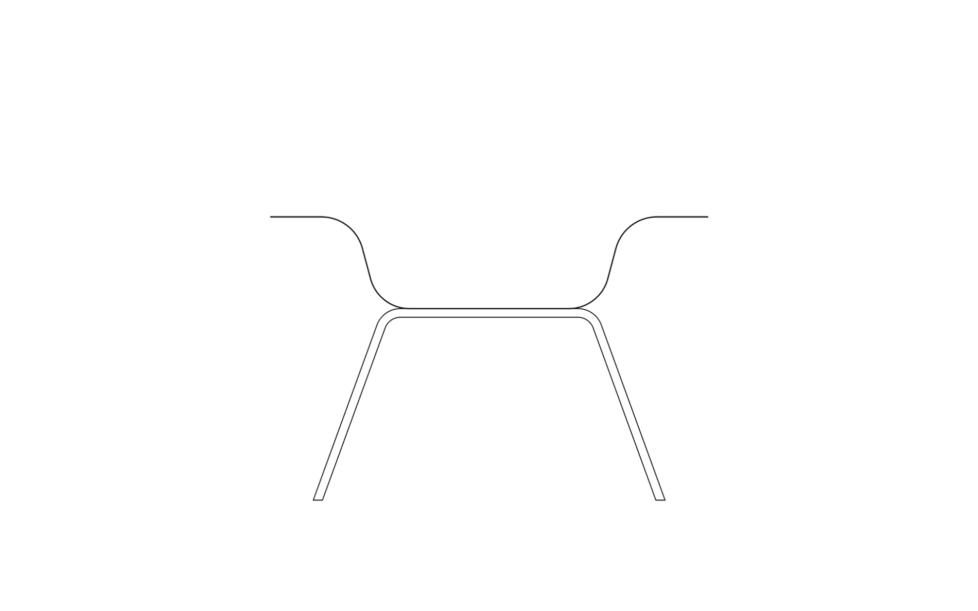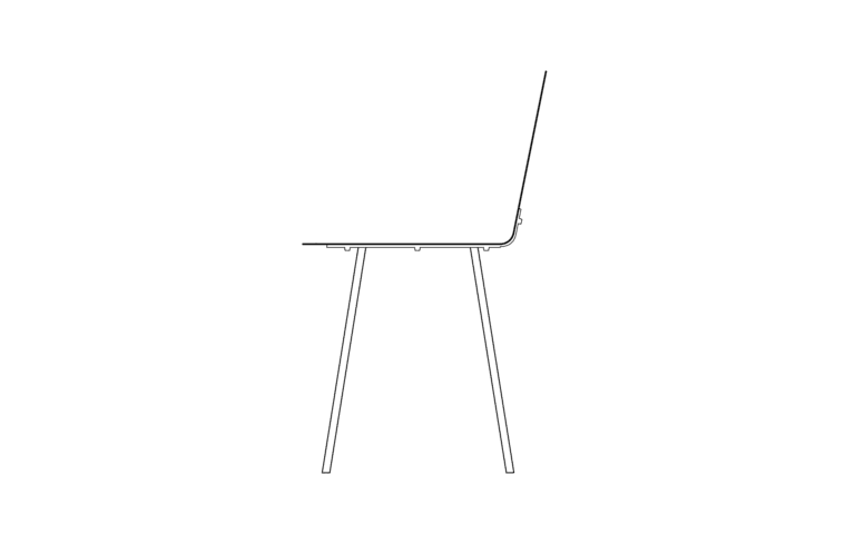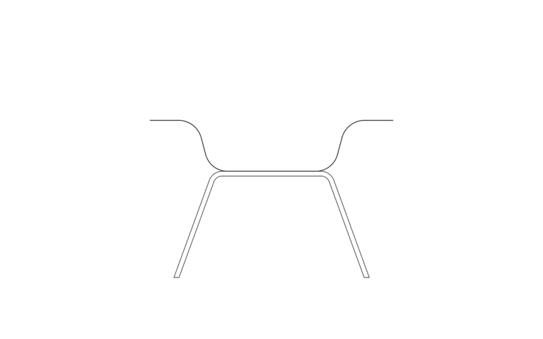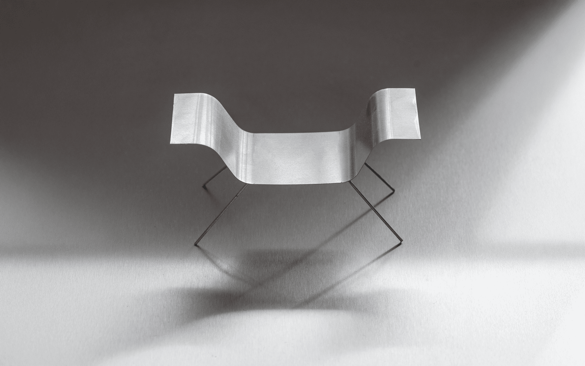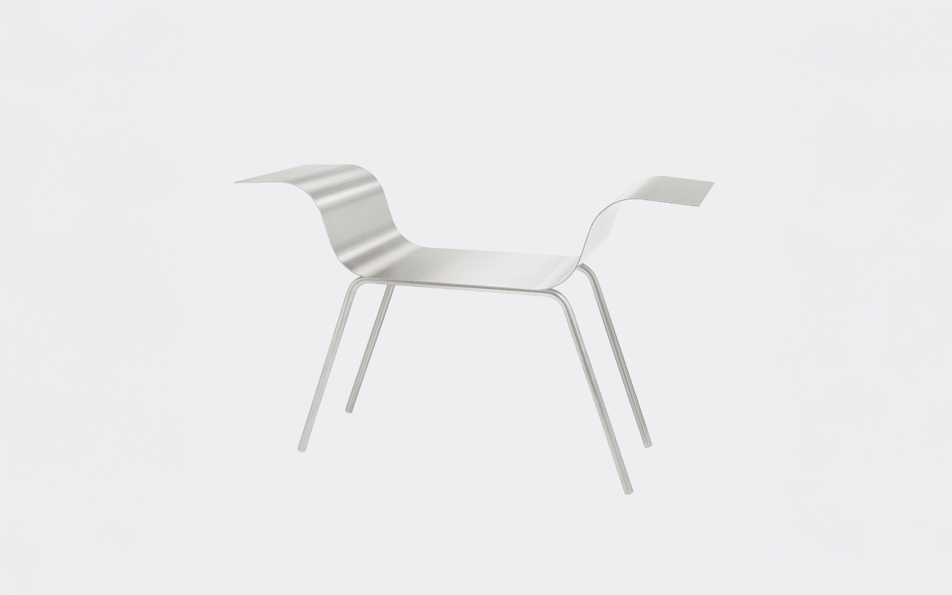 A rectangular sheet of steel is folded to create a clear, stable frame. The form remains open and legible, with geometry functioning as seat and back in one continuous line.