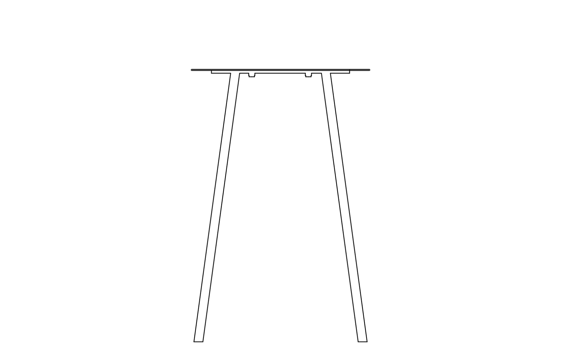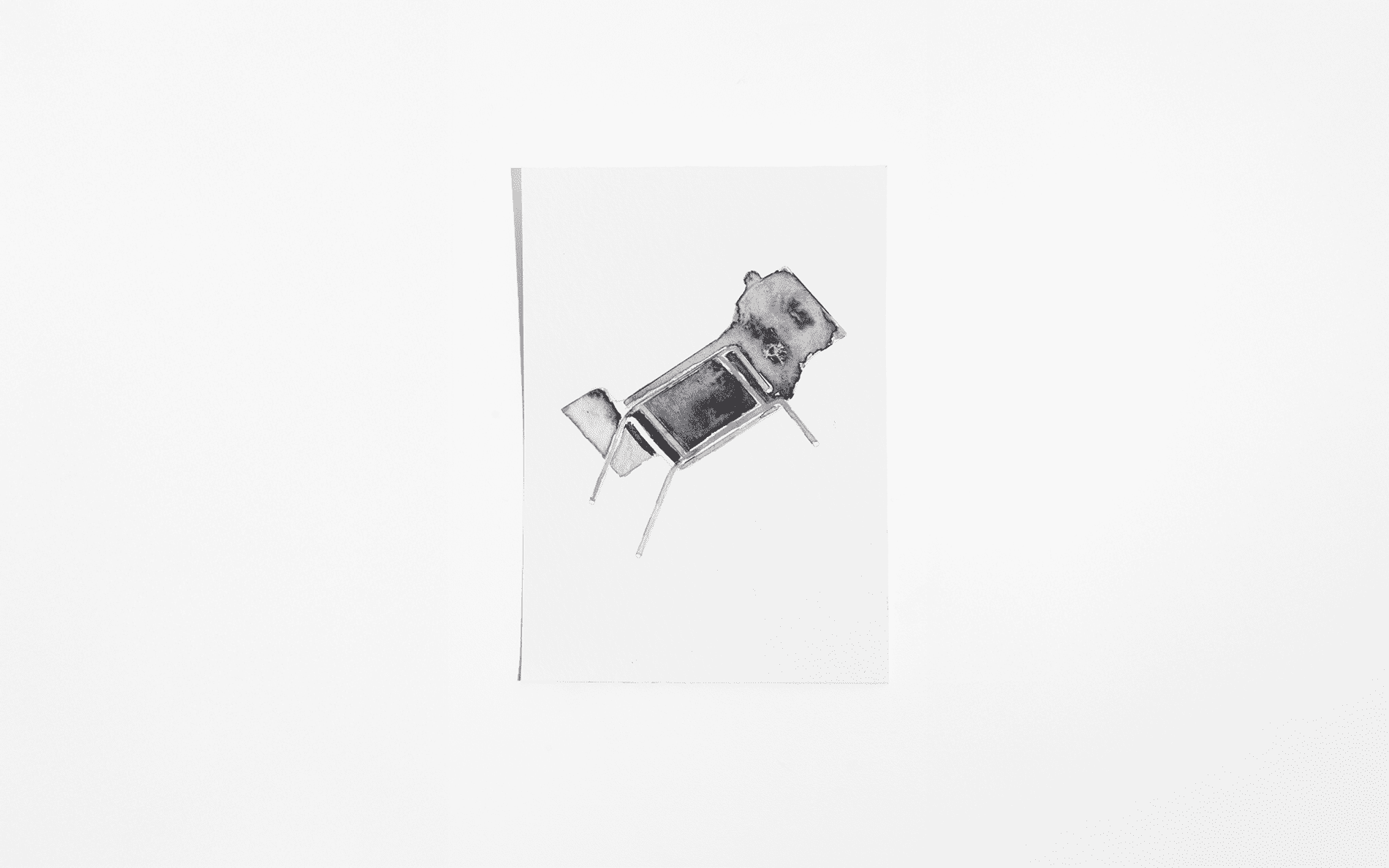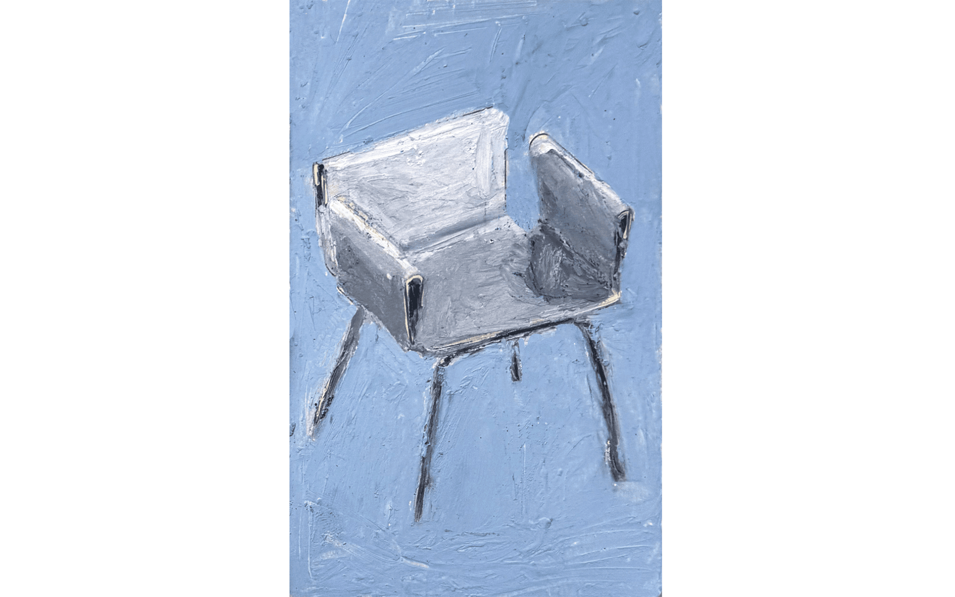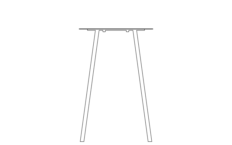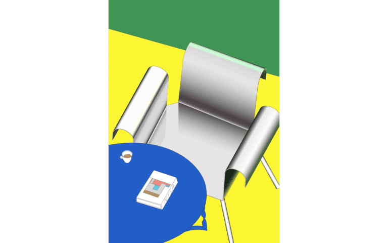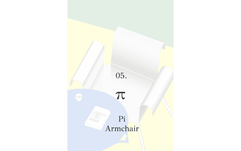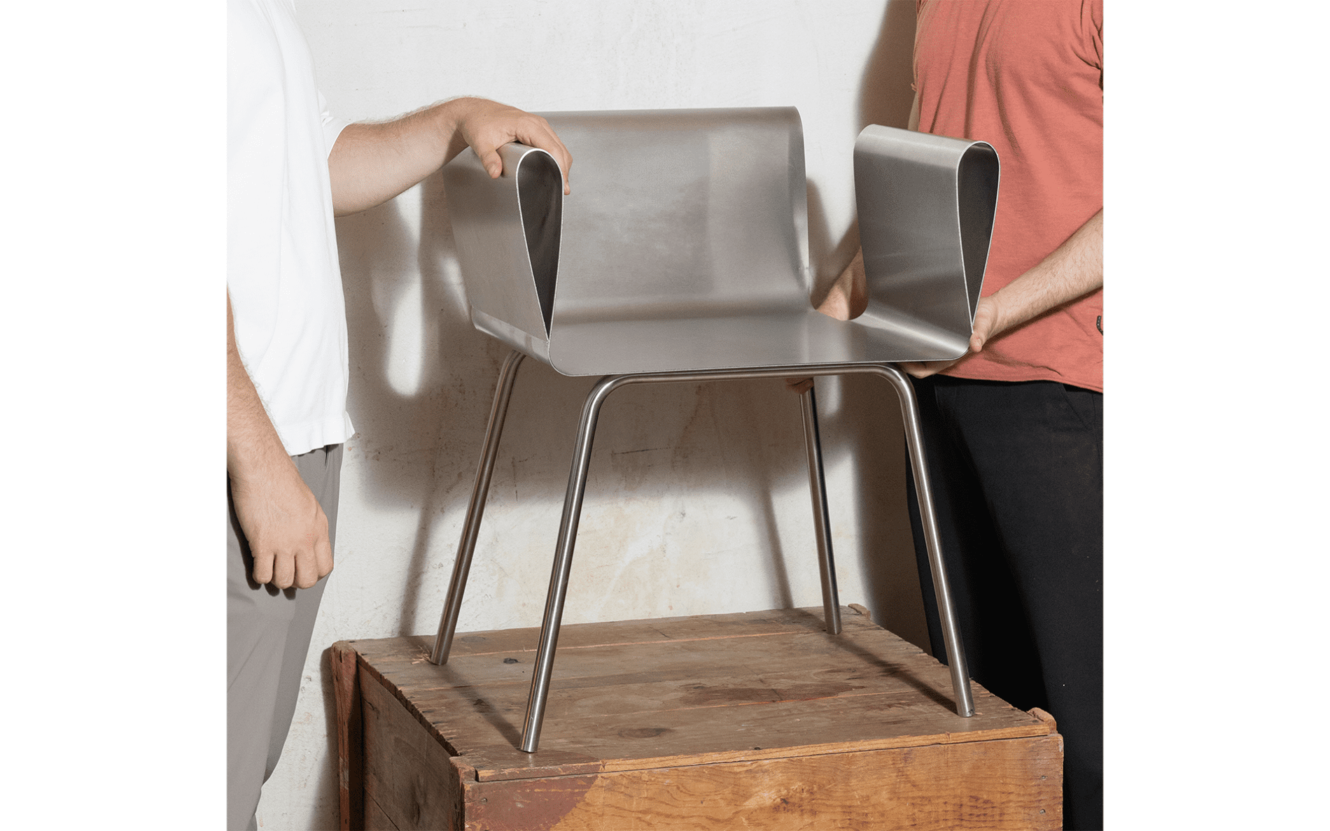 A rectangular sheet of steel is folded to create a clear, stable frame. The form remains open and legible, with geometry functioning as seat and back in one continuous line.