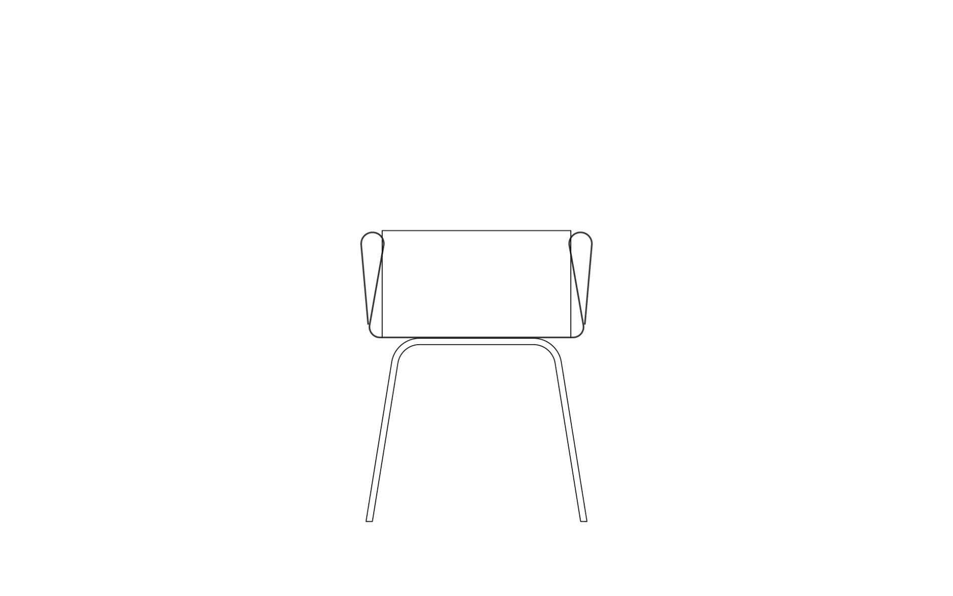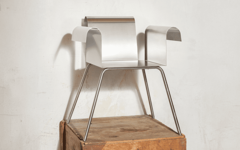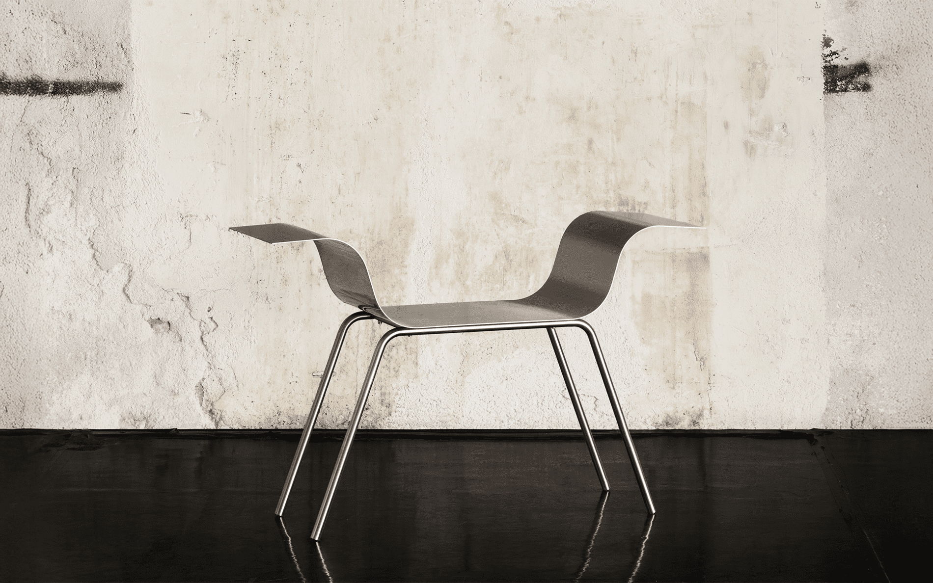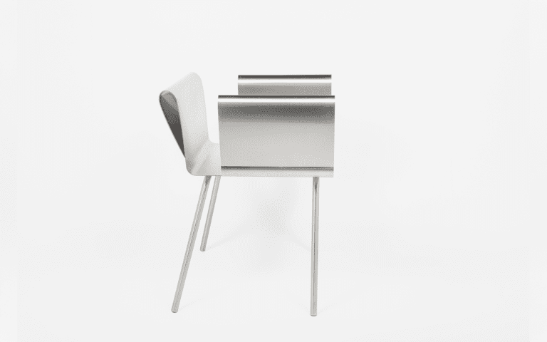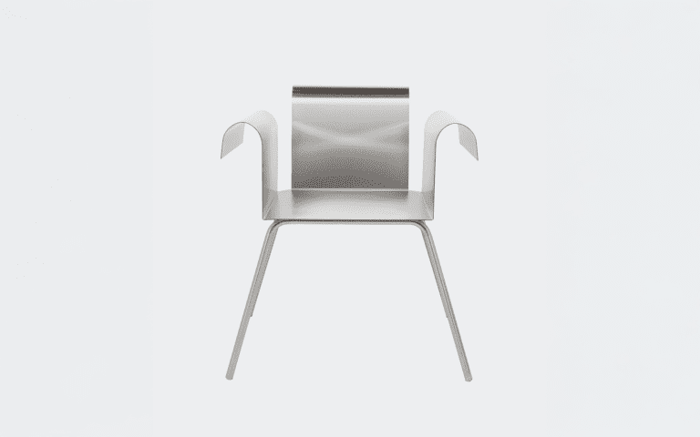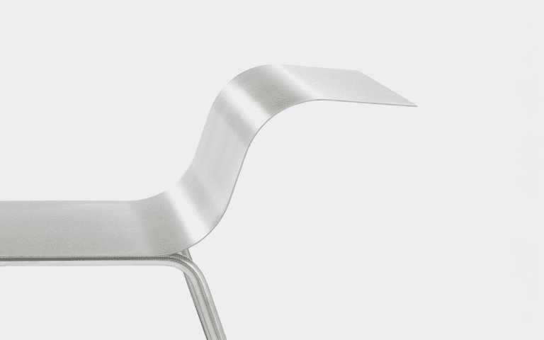 A continuous sheet of steel rises, bends, and returns, forming a clean curve that meets the hand. The back follows the same logic, and its height aligns with that of the armrest.