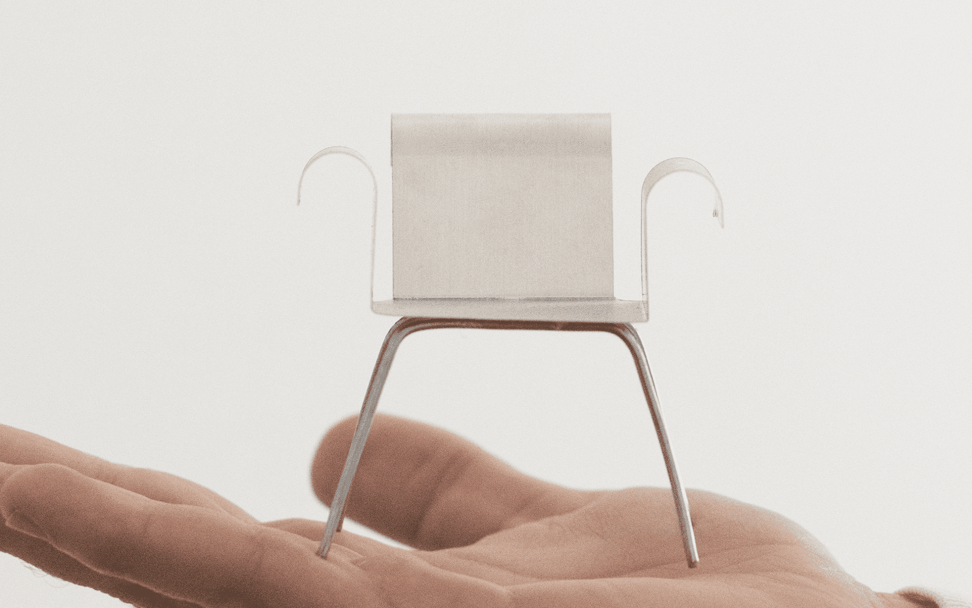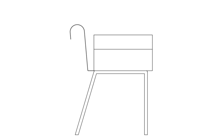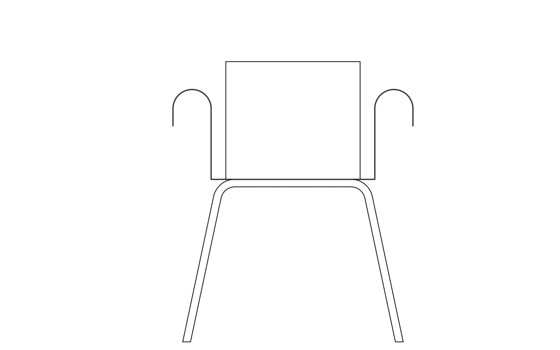 A continuous sheet of steel rises, bends, and returns, forming a clean curve that meets the hand. The back follows the same logic, and its height aligns with that of the armrest.